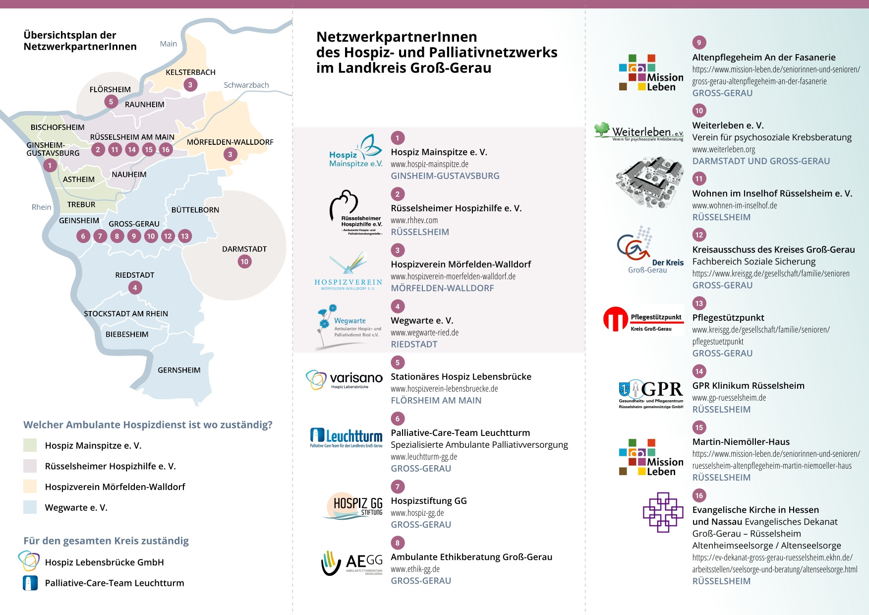 Im Juli 2010 haben sich die in der Hospiz- und Palliativarbeit tätigen Organisationen aus dem Kreis und um den Kreis Groß-Gerau zu einem Netzwerk zusammengeschlossen und bilden in enger Zusammenarbeit mit anderen Diensten ein verlässliches Versorgungsnetz.