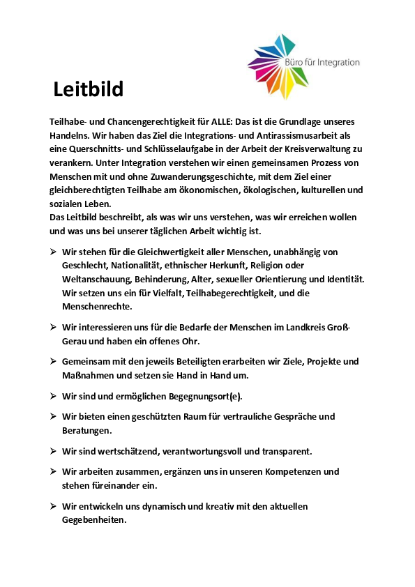 „Vielfalt, Begegnung, Teilhabe, Chancengerechtigkeit und Zukunft“ sind die Leitwörter des Büros für Integration. Wir haben die Ziele diese Leitwörter mit Leben zu füllen, deren Gestaltung als eine Querschnitts- und Schlüsselaufgabe in der internen und externen Arbeit der Kreisverwaltung zu verankern und die Herausforderungen einer von Vielfalt geprägten Gesellschaft im Interesse aller Beteiligten positiv zu gestalten.