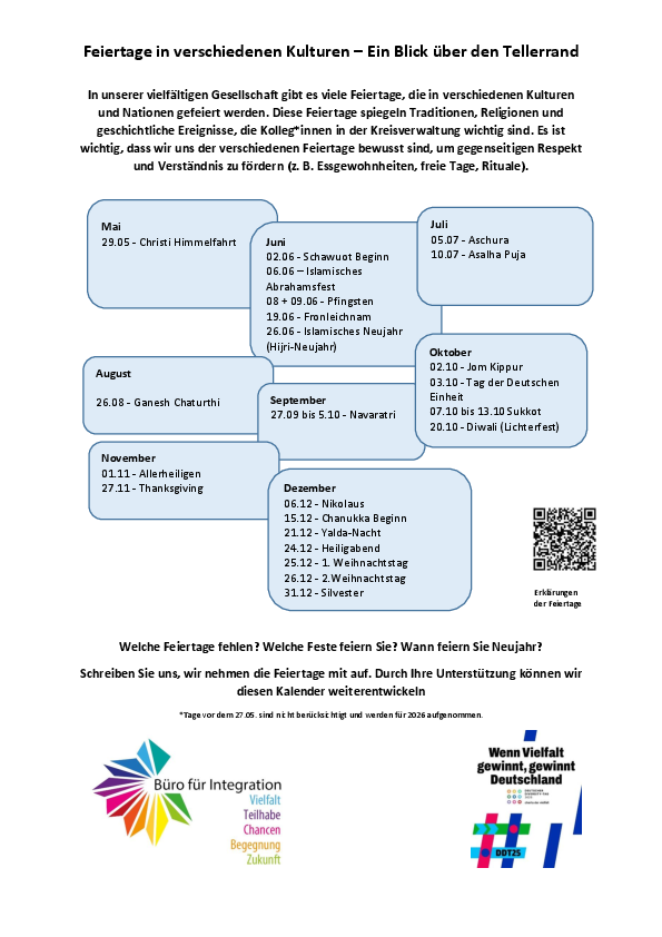 In diesem Jahr richteten wir unser Augenmerk auf Feiertage, die in unterschiedlichen Kulturen und Nationen gefeiert werden. Indem wir uns bewusstmachen, welche Feiertage und Feste von unseren Kolleg*innen gefeiert werden, können wir den Dialog untereinander und eine respektvolle Arbeitsumgebung fördern.
