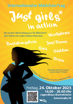 Unter dem Motto „Just girls*“ werden vom 15. September bis 31. Oktober 2025 kreisweite Aktionen für Mädchen* ab 9 Jahren angeboten, bei denen „Mädchen* sein“, aber auch die Rechte auf Bildung, Gewaltfreiheit und Gleichberechtigung gefeiert und auf deren Verletzungen auf der ganzen Welt aufmerksam gemacht wird.