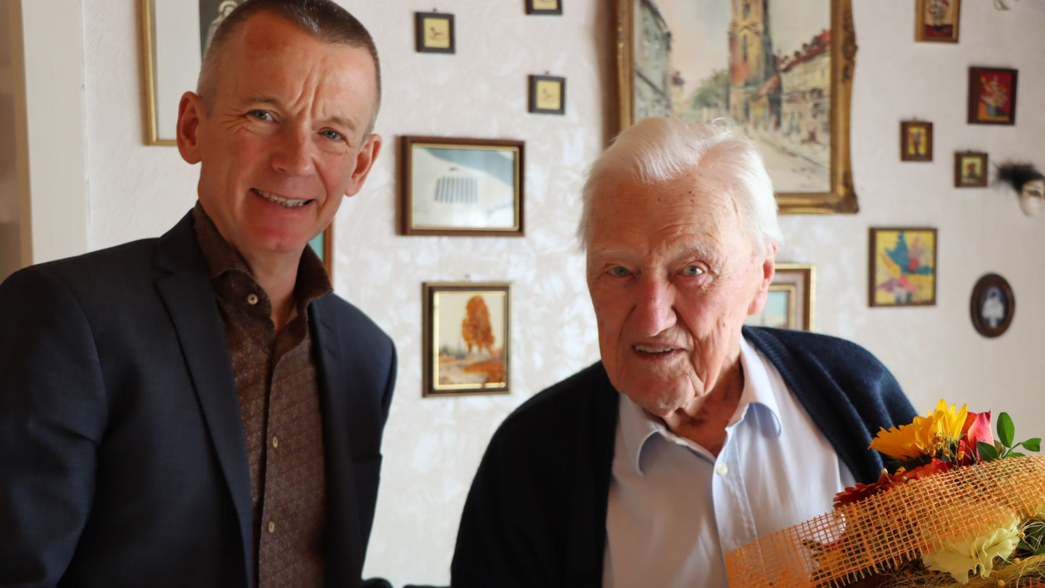 KREIS GROSS-GERAU – 101 Jahre alt ist Bruno Schoreit aus Raunheim am Rosenmontag 2023 geworden. Zu diesem besonderen Geburtstag gratulierte Landrat Thomas Will bei seinem Besuch im Haus des Seniors mit einem großen Blumenstrauß und der Urkunde des Kreises Groß-Gerau, „101 Jahre: Das ist schon außergewöhnlich“, sagte Thomas Will. Schnell war der Landrat im Gespräch mit dem 1922 in Berlin Geborenen, der ihm aus seinem Leben erzählte und - gemeinsam mit seinem Sohn Manfred - gern Fragen zu seiner persönlichen und zur Familiengeschichte beantwortete.