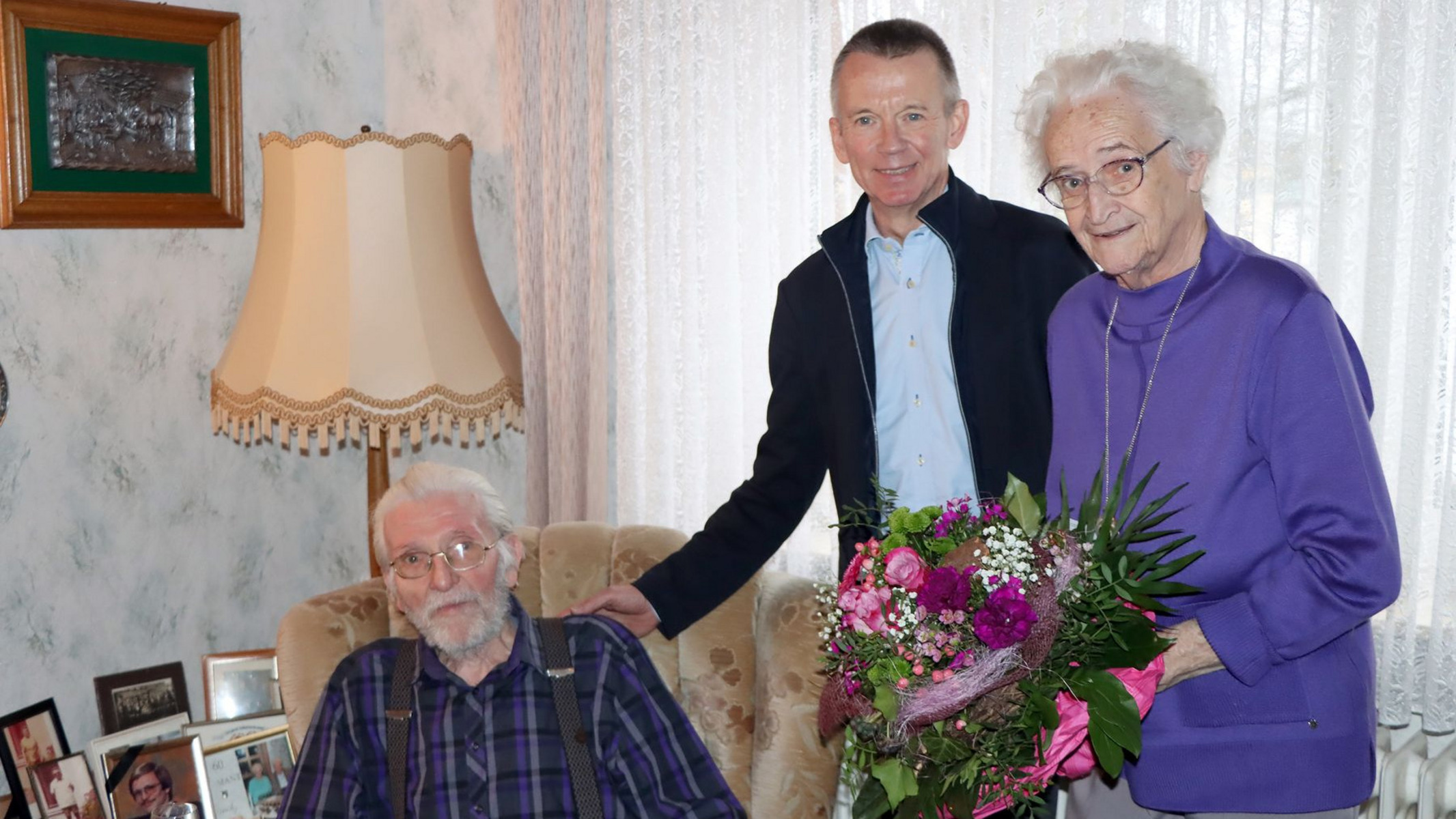 KREIS GROSS-GERAU – Anfang zwanzig waren die Rüsselsheimer Wilhelmine und Hans May, als sie sich das Ja-Wort gaben. Nun durften sie am 16. Januar 2023 das seltene Ereignis der Gnadenhochzeit begehen: 70 Jahre genau sind die beiden verheiratet. Unter den Gratulanten in der Wohnung des Paares waren am Montag auch Landrat Thomas Will und Stadträtin Ursula Metz. Beide brachten Blumen und Urkunden für die Jubilare mit, die sich vor über 70 Jahren „bei de Mussigg“ kennengelernt haben.