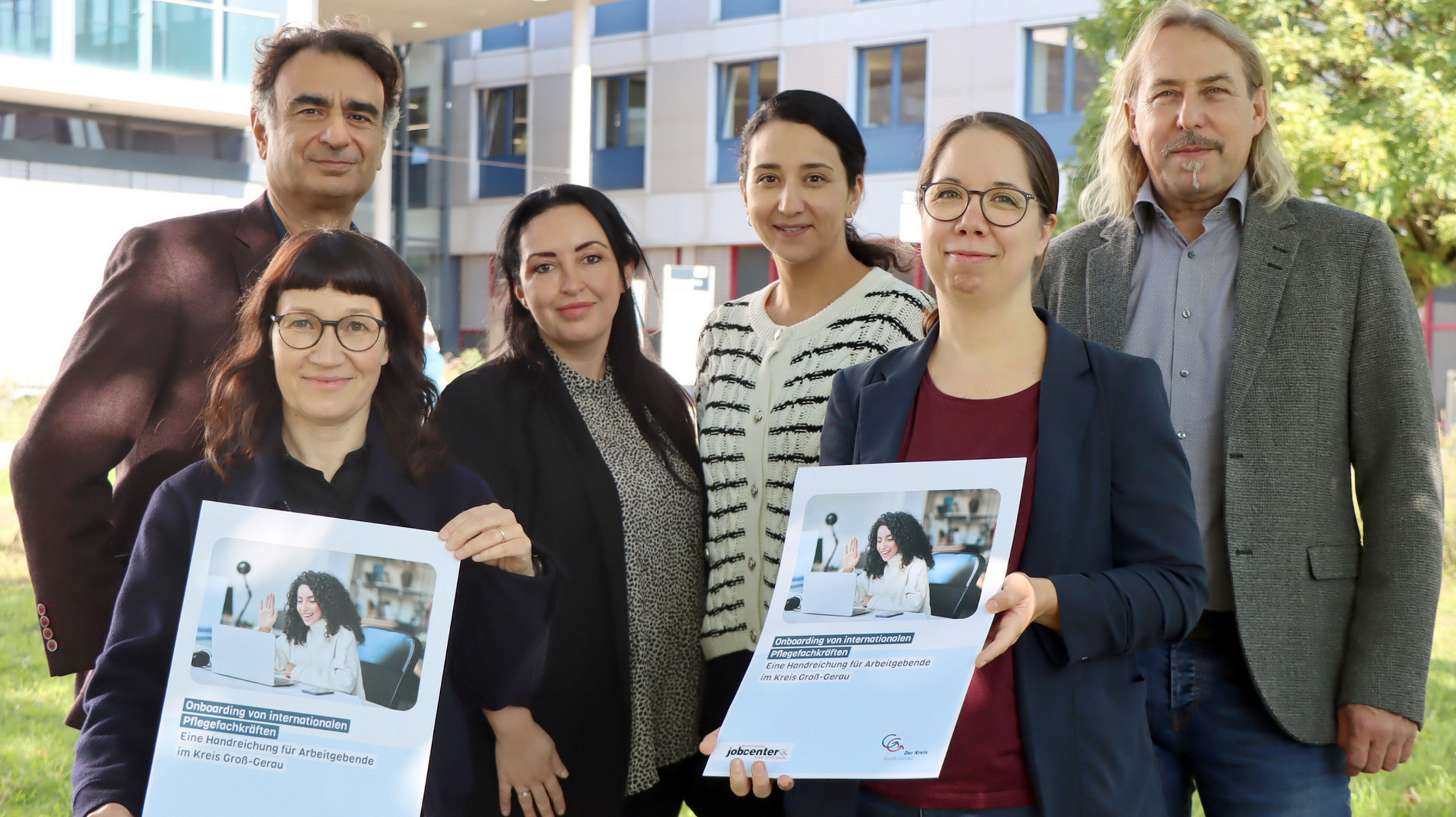 Handreichung gegen Fachkräftemangel: Die Onboarding-Mappe ist das Ergebnis einer Kooperation zwischen der Kreisverwaltung (Sozialplanung für ältere Menschen und Büro für Integration) und der Stelle für Fachkräftesicherung des kommunalen Jobcenters. Das Bild zeigt (von links): Adil Oyan (Erster Kreisbeigeordneter), Sybille Bernard (Fachdienstleitung Sozialplanung), Fatima Talib (Fachstelle Fachkräftesicherung des Jobcenters GG), Sedef Yildiz (Leitung des Büros für Integration), Raphaela Epstein (Fachdienst Sozialplanung), Robert Hoffmann (Leitung Kommunales Jobcenter). Bild: Kreisverwaltung