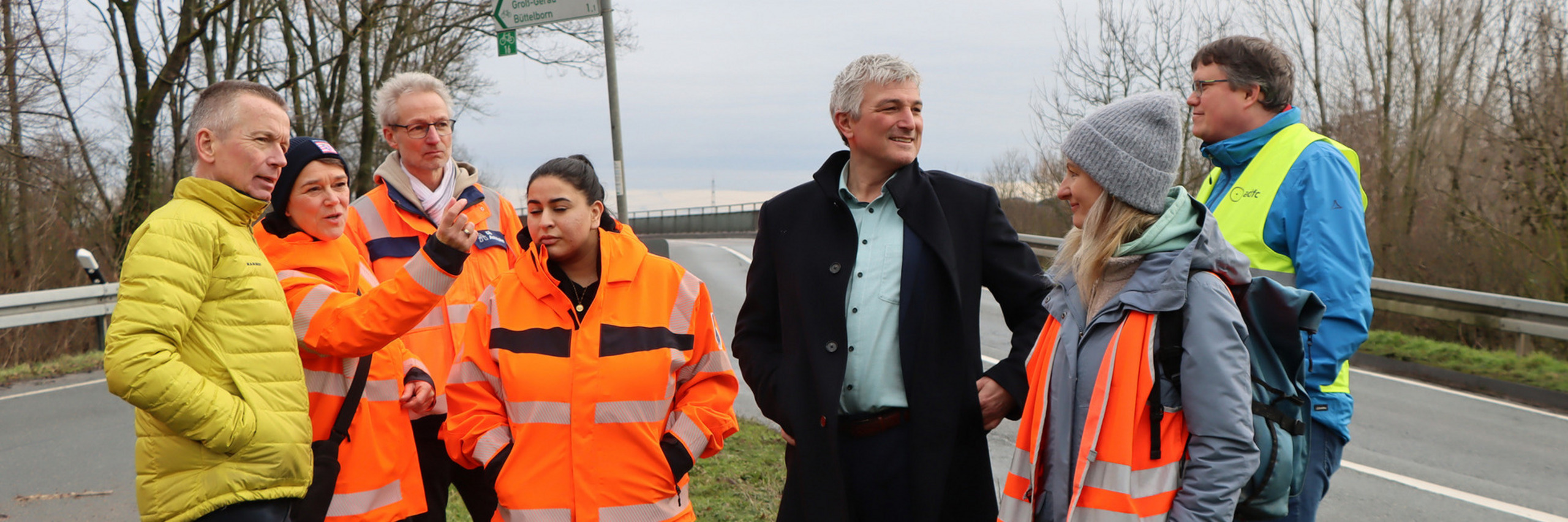 Gefahrstelle: Bei einem Ortstermin haben Fachleute die Situation an der Brücke über die A67 in Büttelborn erörtert, Fußgänger und Radelnde haben hier wenig Platz. Das Bild zeigt (von links): Landrat Thomas Will, Sonja Ebling (Hessen-Mobil), Arndt Jäger von der Autobahn GmbH, Zohal Sidiqyar-Azizi (Hessen-Mobil), Bürgermeister Marcus Merkel, Franziska Knaack, Radverkehrsbeauftragte des Kreises und Mario Schuller, ADFC Kreis Groß-Gerau. Bild: Kreisverwaltung