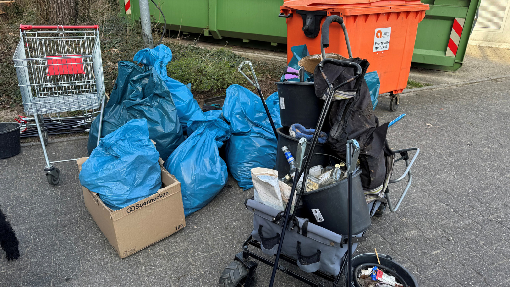 Daneben fand sich der – leider übliche – Standard an Verpackungen, Zigarettenkippen und mehreren Dutzend Schnapsflaschen. Zum Abschluss war die von der Abfall-Wirtschafts-Service GmbH bereitgestellte Tonne randvoll mit blauen Müllsäcken und großen Fundstücken. Der Einsatz hatte sich also wieder gelohnt. Auch der Erste Kreisbeigeordnete Adil Oyan, der den Aktiven einen Besuch abstattete, lobte das Engagement der Helfenden.