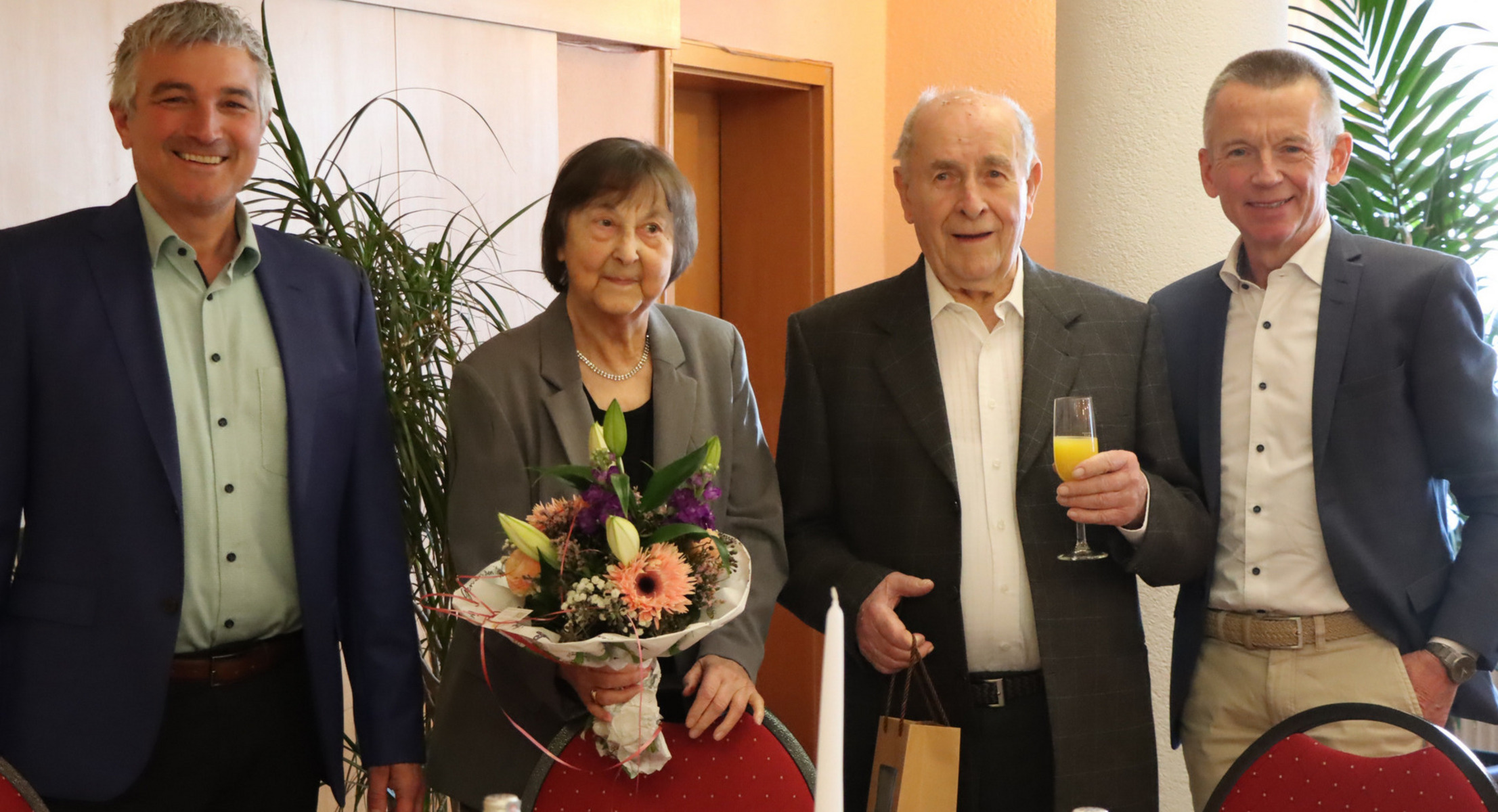 KREIS GROSS-GERAU – Ihre Gnadenhochzeit feierten die Eheleute Elsbeth und Jakob Müller am 9. April im Volkshaus Büttelborn. Sie freuten sich über mehr als 50 Gäste, unter ihnen Familienmitglieder, Nachbarn, Freunde, Schulkameraden - sowie Landrat Thomas Will und Bürgermeister Marcus Merkel. Der Landrat gratulierte zu den 70 Ehejahren mit einem großen Blumenstrauß und einer Urkunde, wünschte dem Paar alles erdenklich Gute auf dem weiteren gemeinsamen Weg.