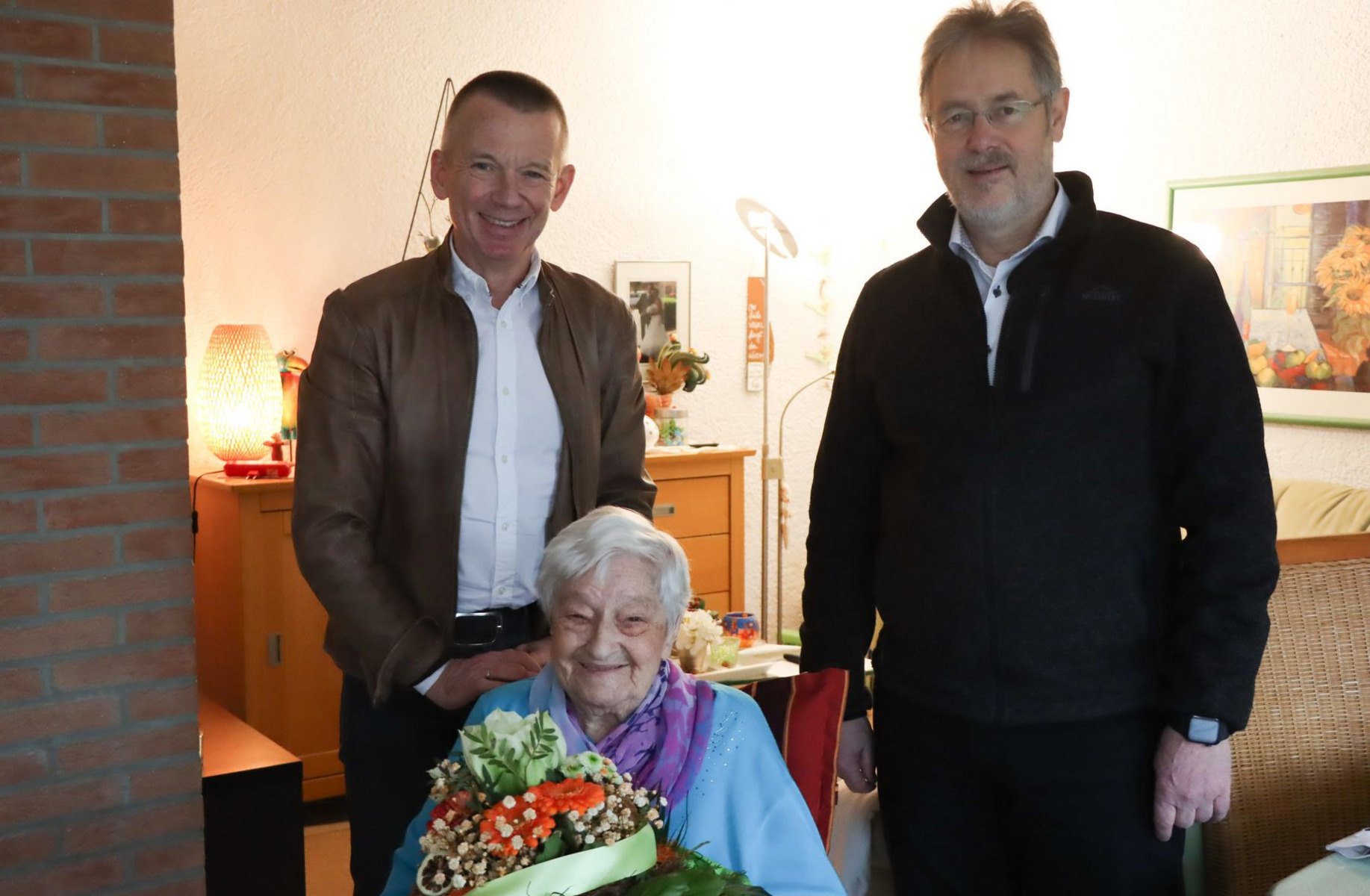 KREIS GROSS-GERAU – Gerda Volk und ihre Tochter Brigitte Dalbert sitzen am Tisch vor einem Mensch-ärgere-dich-nicht-Spiel, als Geburtstagsbesuch eintrifft: Stockstadts Bürgermeister Thomas Raschel und Landrat Thomas Will kommen herein und gratulieren herzlich: Stolze 102 Jahre alt wird Gerda Volk am zweiten Weihnachtsfeiertag. Dafür gibt es kleine Geschenke und Urkunden von Gemeinde, Kreis und Land.