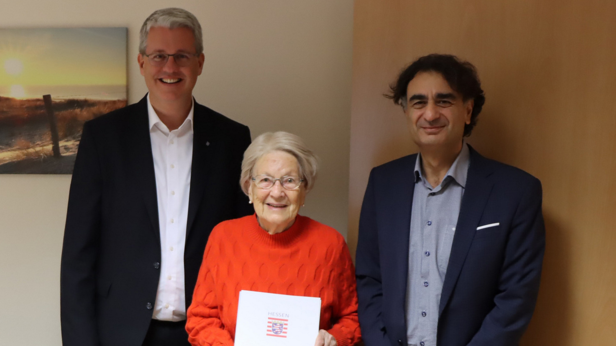 KREIS GROSS-GERAU – Eine muntere Jubilarin trafen der Erste Kreisbeigeordnete Adil Oyan und Rüsselsheims Oberbürgermeister Patrick Burghardt am Montag, 2. Dezember 2024, in der Senterra Pflegeresidenz Am Friedensplatz an. Beide waren gekommen, um Ingeborg Groth nachträglich zum 101. Geburtstag zu gratulieren, ihr Urkunden und Blumen zu überreichen.