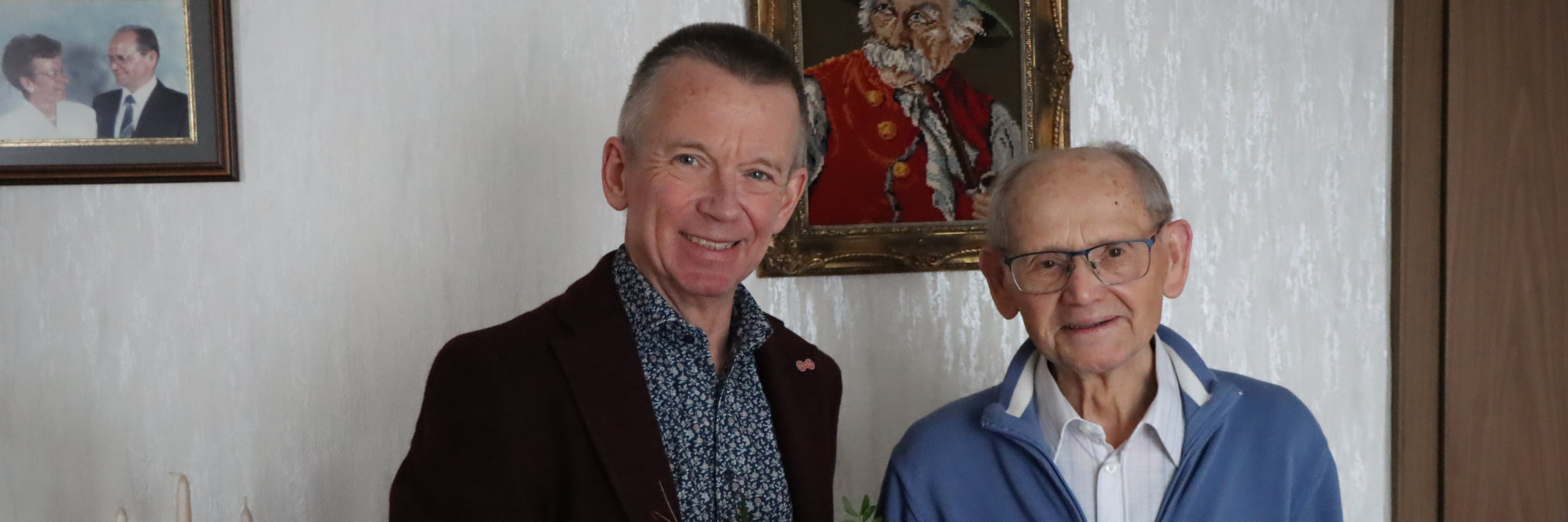KREIS GROSS-GERAU – Anlässlich des 100. Geburtstags von Karl-Adam Dill besuchte Landrat Thomas Will den Jubilar am Montag, 12. Januar. Zwei Tage zuvor, am Geburtstag selbst, hatte der rüstige Königstädter mit Familie im Restaurant Höll am Main gefeiert. Er lebt noch immer in seinem Haus in Königstädten, wo er von seinen Töchtern und einer Haushaltshilfe unterstützt wird. Thomas Will war überrascht und erfreut, wie fit Karl-Adam Dill in seinem hohen Alter noch ist – und zwar körperlich wie geistig. Der Landrat überbrachte die Glückwünsche des Kreises mitsamt Urkunde und Blumenstrauß und nahm sich eine runde Dreiviertelstunde Zeit für eine angeregte Unterhaltung.