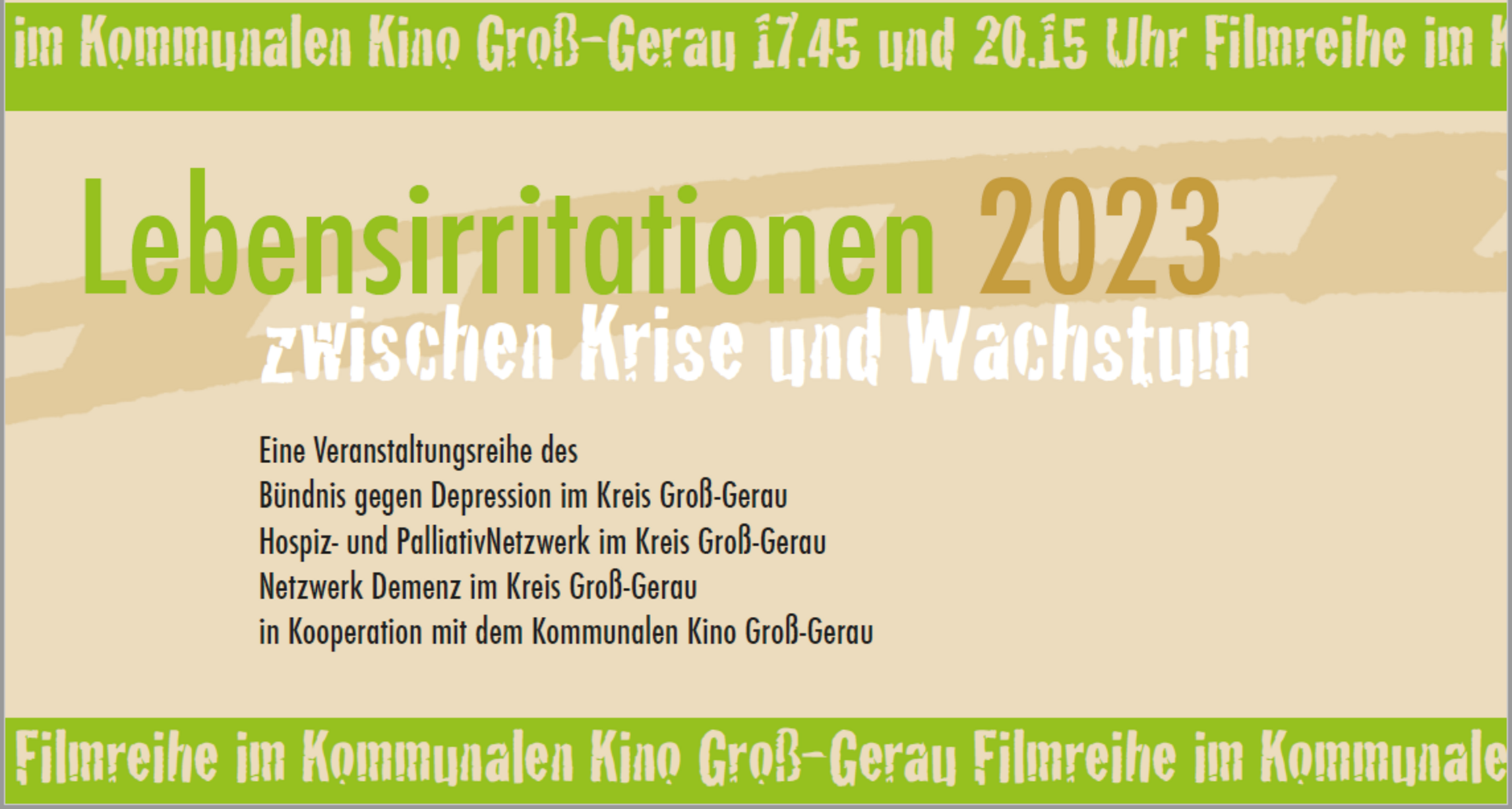 Die diesjährige Filmreihe „Lebensirritationen“ beginnt ab 28.Februar 2023 im kommunalen Kino Groß-Gerau und beschäftigt sich wie gewohnt in drei Filmabenden mit den Themen Depression, Demenz, Verlust und Trauer.