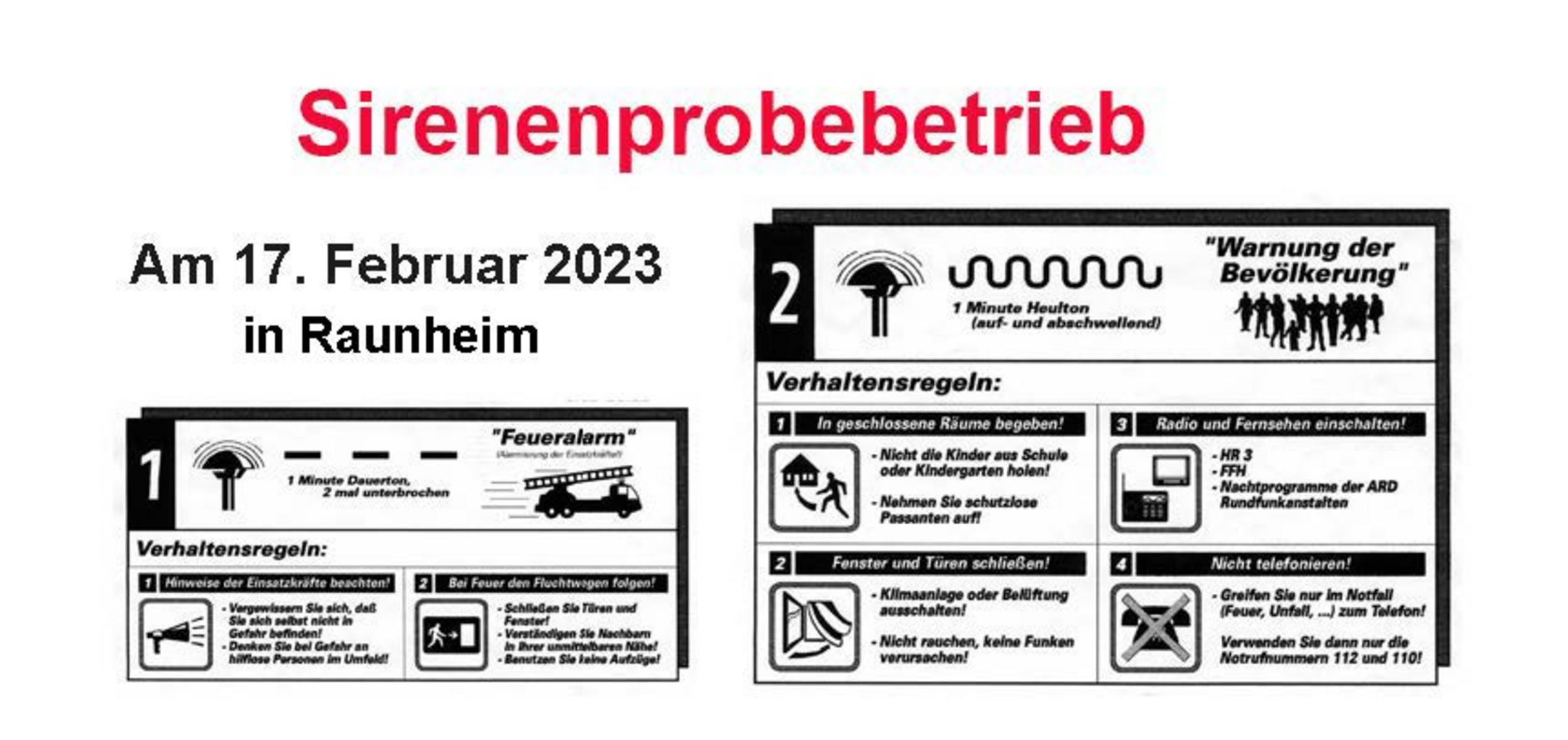 Um diesen bescheinigten technischen Zustand der Sirenen zu verifizieren, ist eine Funktionsprobe erforderlich. Der Probealarm „Warnung der Bevölkerung“ ist, wie die Gefahrenabwehr des Kreises Groß-Gerau mitteilt, für Freitag, 17. Februar 2023, um 10 Uhr geplant. Die Entwarnung folgt um 10.05 Uhr.