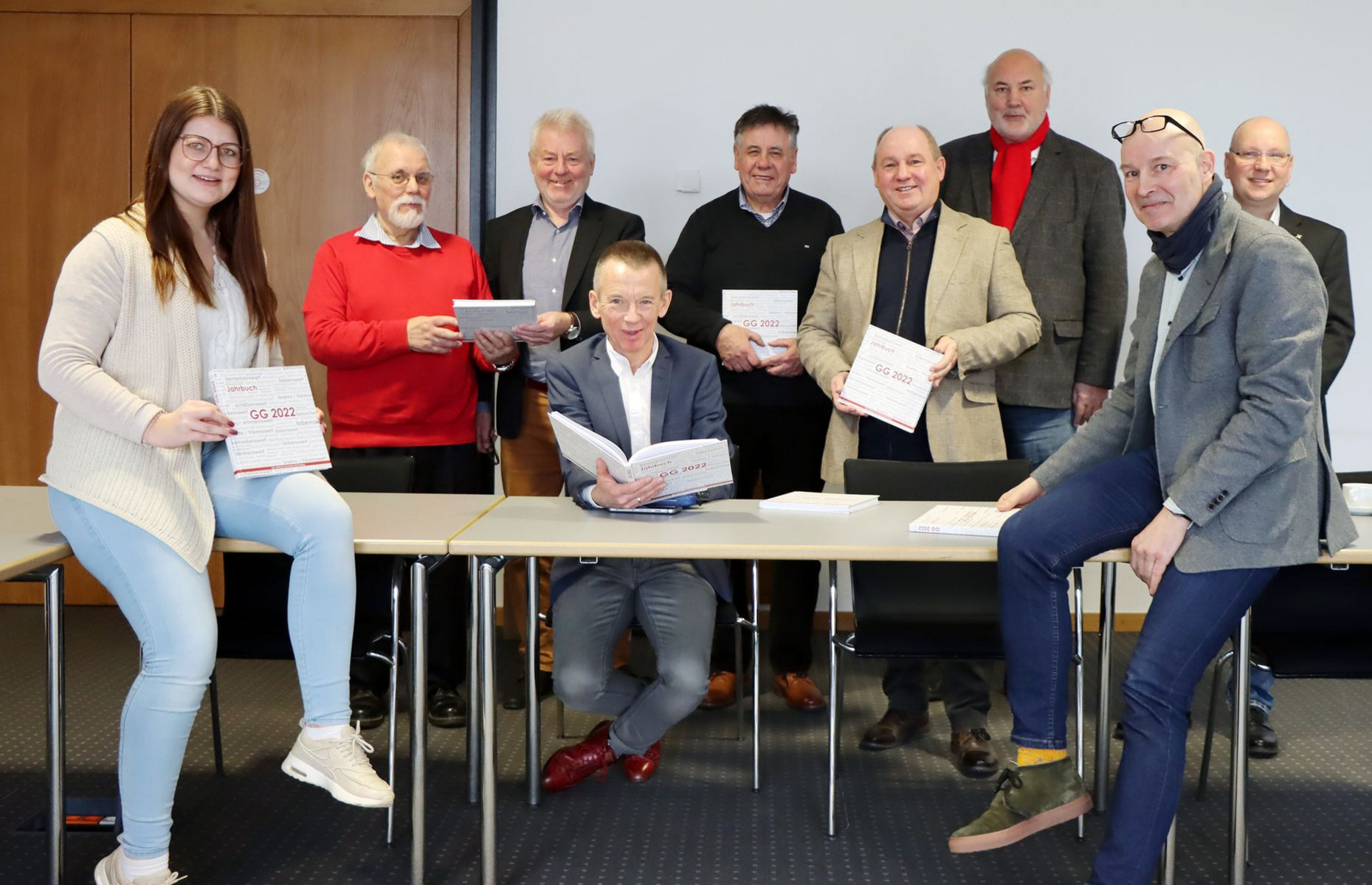 Druckfrisch: Landrat Thomas Will mit dem neuen Jahrbuch des Kreises Groß-Gerau, umrahmt von den ehrenamtlich tätigen Redaktionsmitgliedern und Autoren sowie den Verantwortlichen der Kreispressestelle. (Von links): Annina Scheer (Kreispressestelle), der Journalist Walter Keber, Museumsleiter Jürgen Volkmann, Landrat Thomas Will, der Pädagoge Edgar Lutz, Stadtarchivar Hartmut Blaum, Kulturwissenschaftler Prof. Dr. Wolfgang Schneider, Pressesprecher Volker Trunk und Stadtarchivar Christian Schönstein. Bild: Kreisverwaltung Groß-Gerau