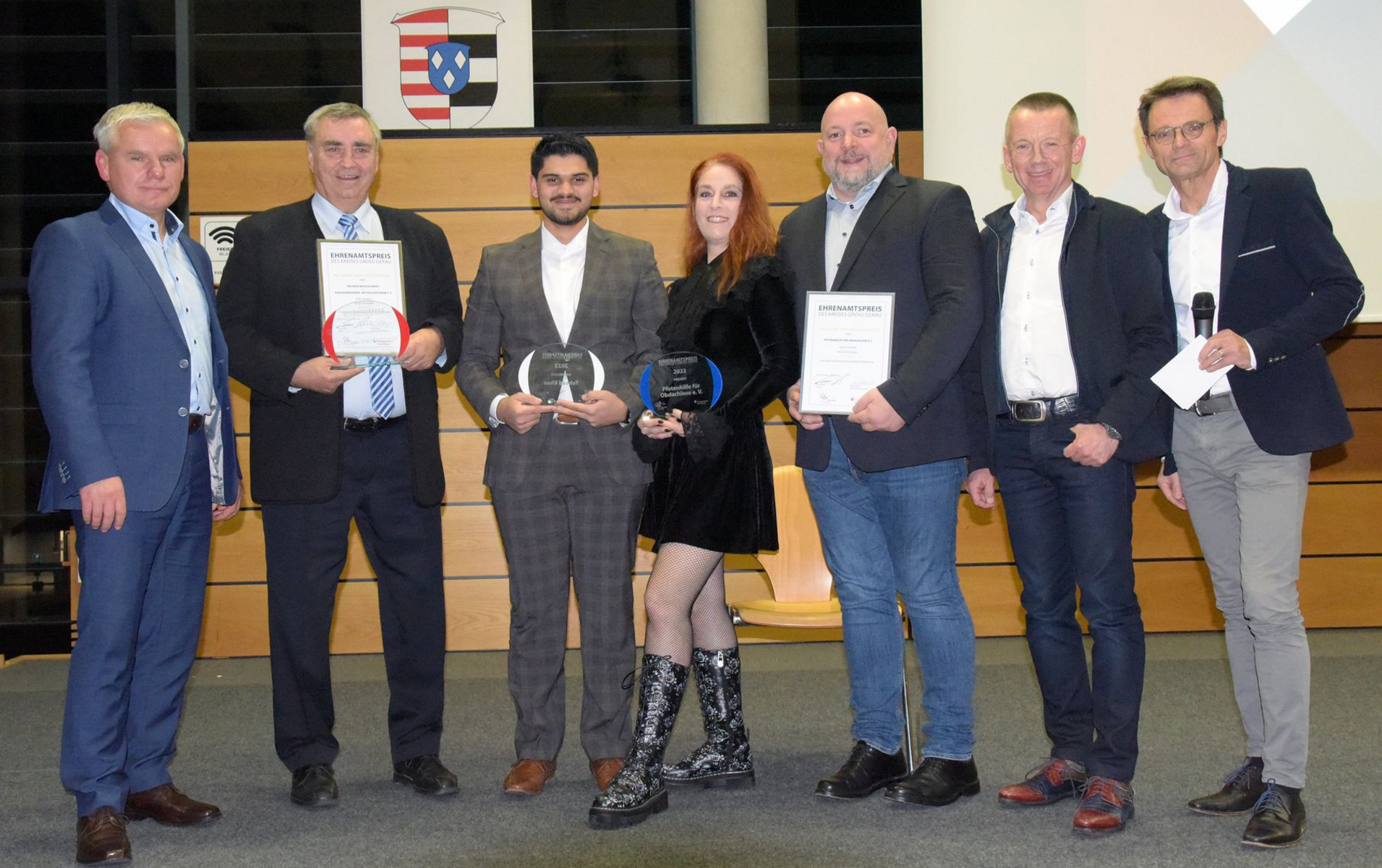 KREIS GROSS-GERAU – Landrat Thomas Will und Kreissparkassen-Personalchef Thomas Münstermann haben Toheed Khan, Dietmar Meinlschmidt sowie den Verein „Pfotenhilfe für Obdachlose“ im Landratsamt mit dem Ehrenamtspreis des Kreises Groß-Gerau ausgezeichnet. Mit diesem Preis würdigten Kreis und Kreissparkasse vorbildliches ehrenamtliches Engagement in den Kategorien Nachwuchskraft, Lebenswerk und beispielhaftes Projekt. Neben Urkunde und Trophäe erhielten die Geehrten jeweils ein Preisgeld in Höhe von 1000 Euro, das die Sparkasse gestiftet hat.