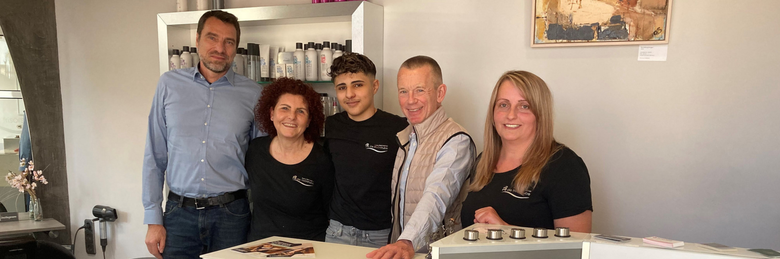 Ihr sei es wichtig, sich durch Qualität von anderen abzuheben. Darum legt die Frisörmeisterin sehr viel Wert auf Beratung der Kunden, etwa auch im Hinblick auf Inhaltsstoffe der Produkte. Sie entwickelt zusammen mit Branchen-Kolleg*innen eigene Pflegeprodukte, erfuhr der Landrat.