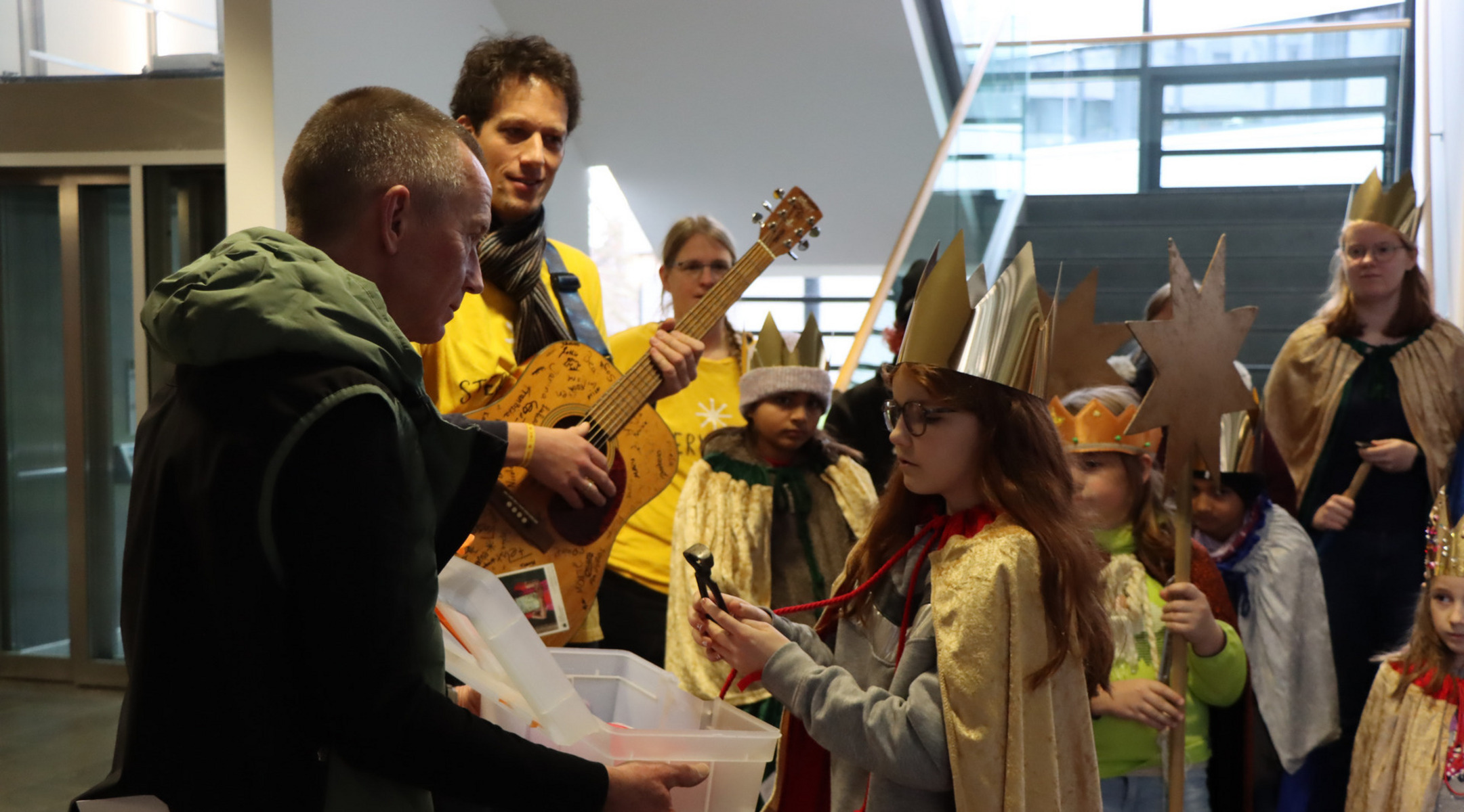 Damit sprachen die Sternsinger zugleich an, unter welchem Motto die bundesweite Aktion in diesem Jahr steht: Schule statt Fabrik – Sternsingen gegen Kinderarbeit. Sie sammeln Spenden, um damit Partnerorganisationen zu helfen, die armen Kindern den Besuch der Schule ermöglichen, zum Beispiel in Bangladesch.