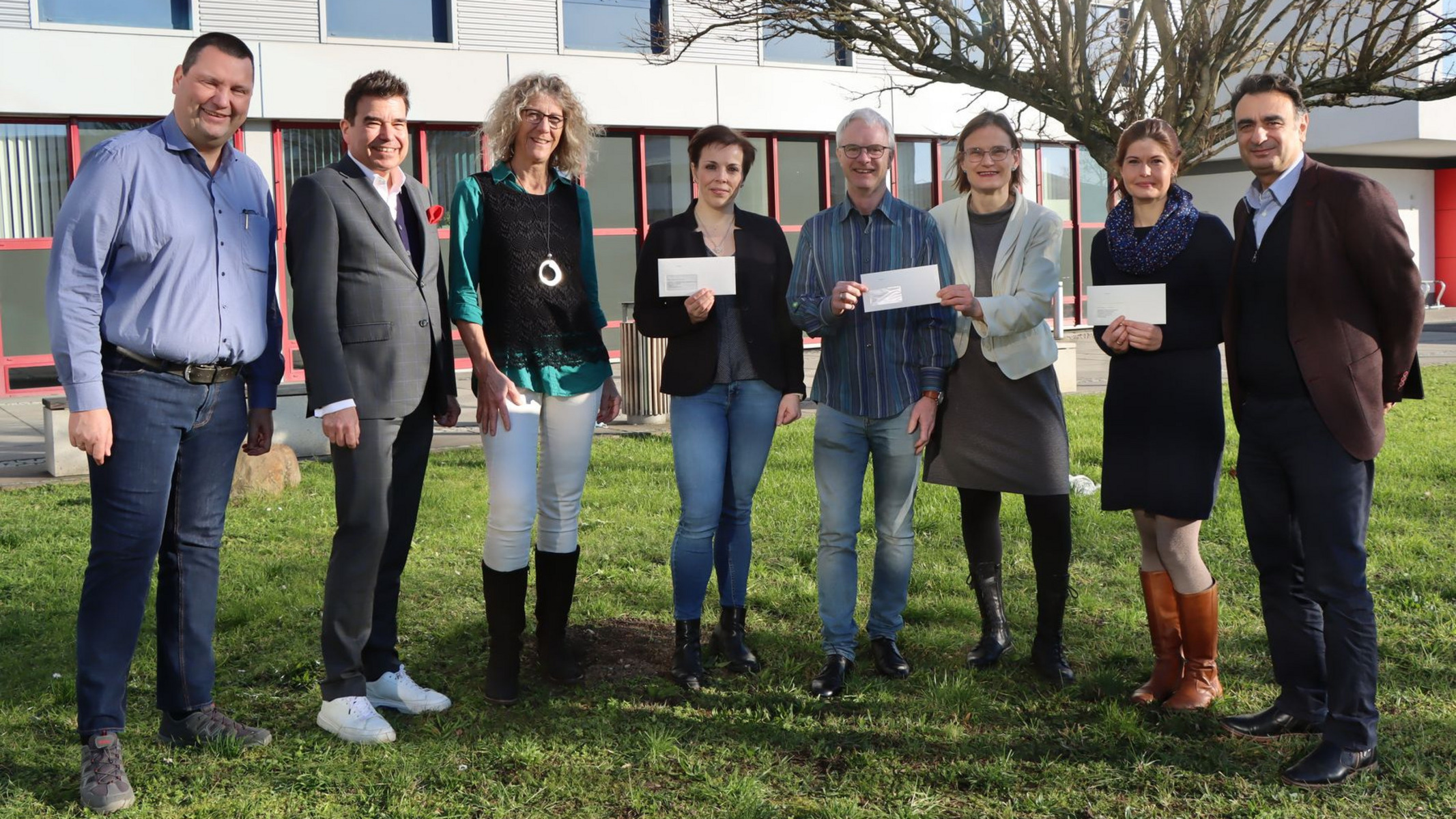 Zum Spendentermin kamen zusammen (von links) Oliver Hegemann, Fachbereichsleiter Soziale Sicherung der Kreisverwaltung, Matthias W. Send, Prokurist der ENTEGA AG, Ilona Janz und Annett Vielemeyer von der Alzheimer- und Demenzkranken Gesellschaft Rüsselsheim e.V., Heiko Michel und Cordula Kaßner-Wellems von Basis e.V. Mainspitze, Nicole Novak von der „Atempause“ Riedstadt und Erster Kreisbeigeordneter Adil Oyan. Foto: Kreisverwaltung