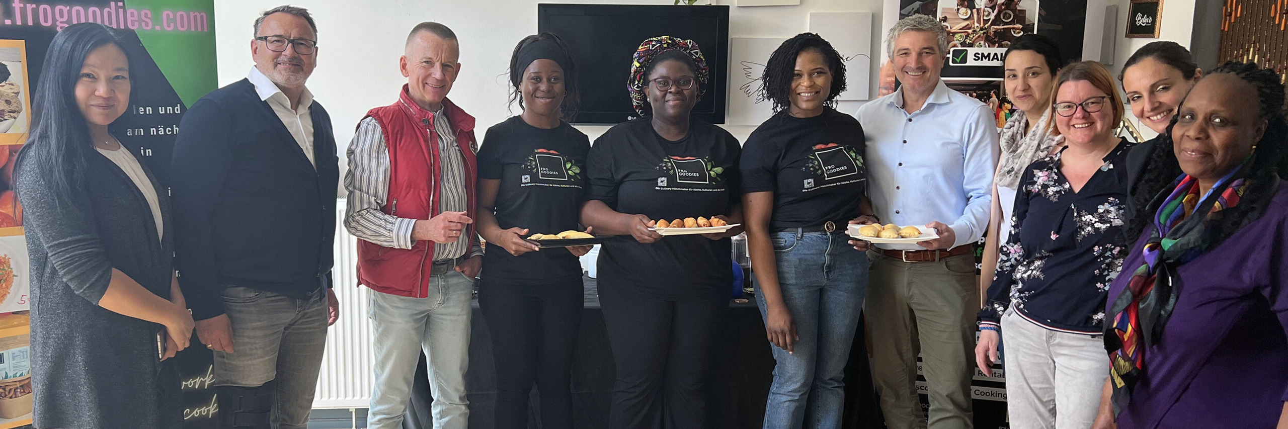 Gruppenbild beim Betriebsbesuch des Landrats (von links): Shixun Hennecke, verantwortlich für die asiatische Küche bei FroGoodies, Vertriebsleiter Veljko Kovacevic, Landrat Thomas Will, Alessia Kassi (Küchenaushilfe), Emanuella Ndifor (Küchenmanagerin), Gründerin Florence Hofmann-Mua, Bürgermeister Marcus Merkel, Sedef Yildiz, Leiterin Büro für Integration der Kreisverwaltung, Julia Flächsenhaar und Mareen Stahl von der Wirtschaftsförderung des Kreises sowie Memunatu Bangura (Köchin). Foto: FroGoodies