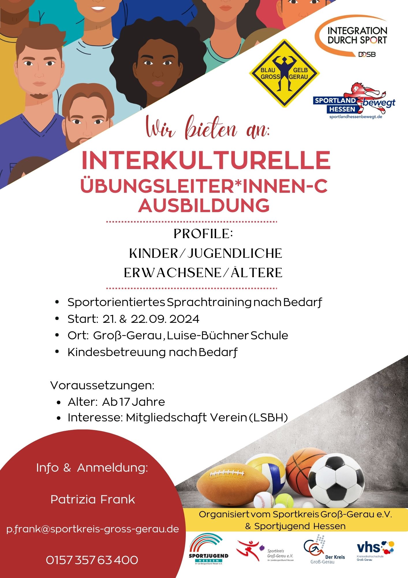 Die Einführung von Bewegungskoordinatorinnen und -koordinatoren ist ein Pilotprojekt im Rahmen des Landesprogramms SPORTLAND HESSEN bewegt und wird durch das Hessische Ministerium für Familie, Senioren, Sport, Gesundheit und Pflege (HMFG) gefördert. Fragen und Anmeldung zur Interkulturellen Übungsleiter-Ausbildung: Patrizia Frank; p.frank@sportkreis-gross-gerau.de; Telefon: 0157 357 63 400.
