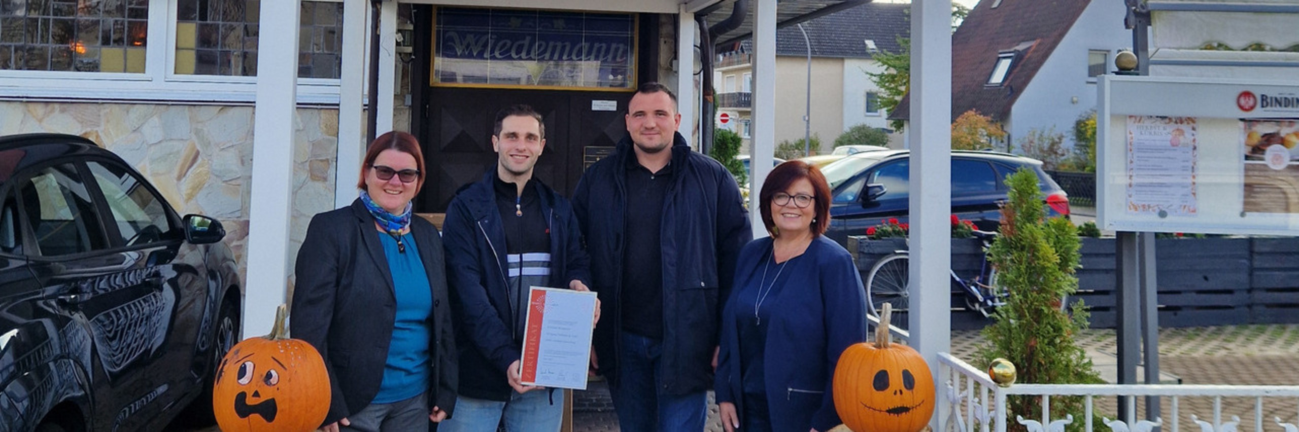 KREIS GROSS-GERAU – Die südhessischen Zertifikatsträger 2024 von „Hessen à la Carte“, der Kooperation der hessischen Regionalküche, wurden im September veröffentlicht. Dazu gehört das Hotel Weinhaus Wiedemann. In dieser Woche folgte nun die Übergabe dieses Zertifikats in Ginsheim-Gustavsburg. Beatrix Preß und Julia Flächsenhaar von der Wirtschaftsförderung des Kreises Groß-Gerau übergaben die Auszeichnung an die sichtlich stolzen Empfänger: Inhaber Wolfgang Trollmann und Hotel- und Restaurantleiter Sascha Heinecke.