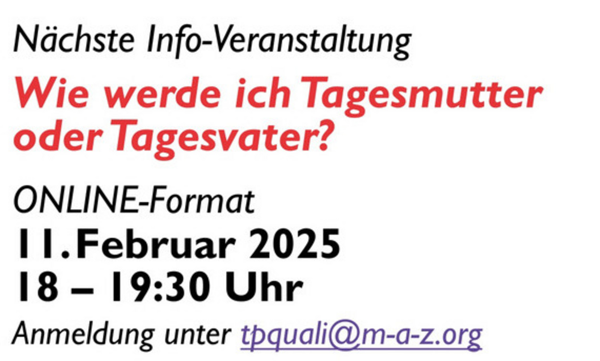 KREIS GROSS-GERAU – Im Kreisgebiet wird die Kindertagespflege seit Jahren kontinuierlich in einer Kooperation von TagesKids Kreis Groß-Gerau mit dem Bildungsträger MAZ e.V. ausgebaut. Näheres zur kostenfreien Qualifizierung im kommenden Jahr erfahren Interessierte in der Informationsveranstaltung „Zuhause selbstständig. Wie werde ich Tagesmutter oder Tagesvater?“ am Dienstag, 11. Februar 2025, 18 bis 19.30 Uhr im Online‑Format. Nach erfolgter Anmeldung per E‑Mail unter tpquali@m-a-z.org bis spätestens 7. Februar erhalten Teilnehmende einen Einladungslink zugesendet. Informiert wird auch über die persönlichen, formalen und gesetzlichen Vorgaben für diese selbständige Tätigkeit sowie entsprechende Verdienstmöglichkeiten.