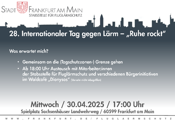 Gemeinsam an die (Tagschutzzonen-)Grenze gehen! Die Stabsstelle für Fluglärmschutz lädt aus diesem Anlass zum 28. Tag gegen Lärm alle Interessierten auf den Spielplatz am Sachsenhäuser Landwehrweg ein, um Wissenswertes über die Fluglärmsituation vor Ort und auch die damit zusammenhängenden Schutzzonen und Siedlungsbeschränkungen zu erfahren.